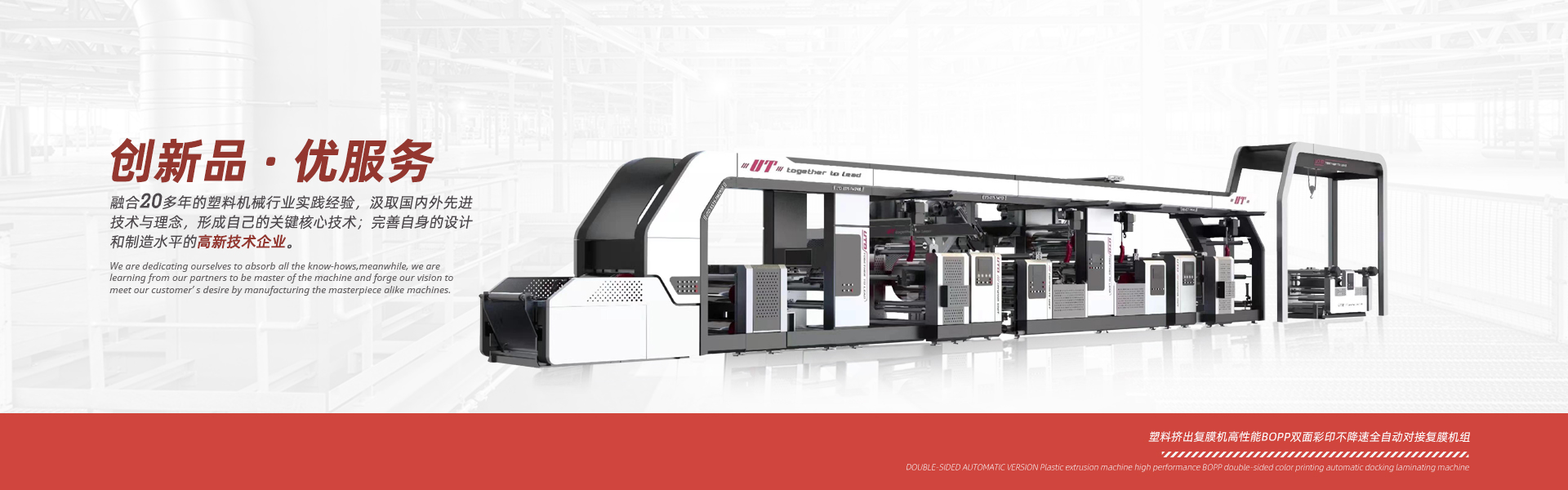 優(yōu)特機(jī)械精心致力于塑料編織行業(yè)、紙塑軟包裝行業(yè)、輪胎制造行業(yè)等成套生產(chǎn)設(shè)備的設(shè)計(jì)和制造,并為用戶提供生產(chǎn)工藝及培訓(xùn)。我們的服務(wù)范圍包括各類塑料覆膜機(jī)、紙張覆膜機(jī)、BOPP彩印膜雙面自動對版覆膜機(jī)、 紙塑邊縫三合一覆膜機(jī)、中縫印刷制袋機(jī)、以及輪胎行業(yè)循環(huán)回收使用的隔離膜生產(chǎn)線。